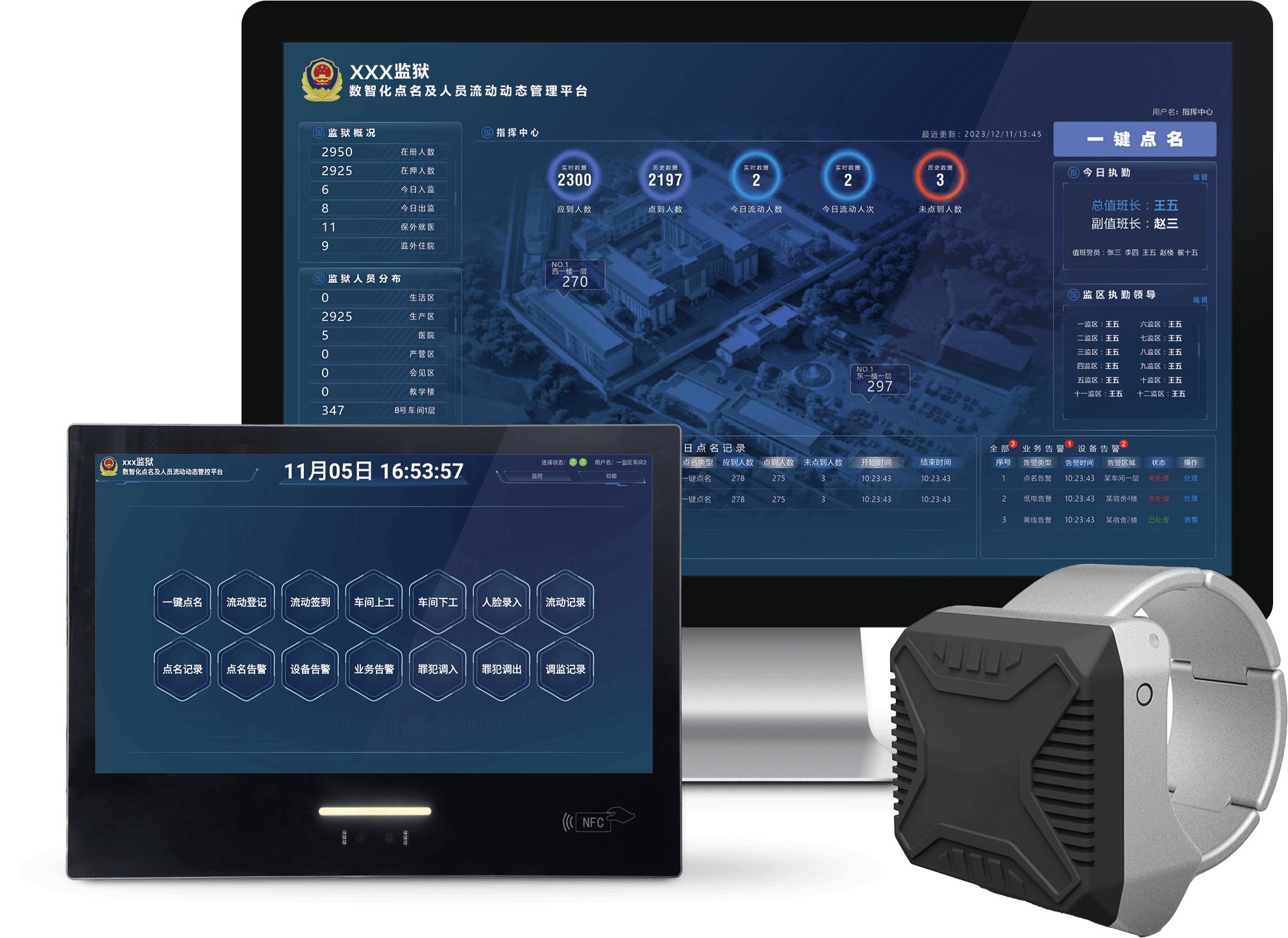监所数智化点名及人员流动动态管控系统由指纹点名胸卡、数据接收基站、人脸点名终端、区域管控屏、标签读写器、IP音柱、信息采集终端、数智化点名及人员流动动态管控平台和数智化点名及人员流动动态管控app组成,通过指纹点名胸卡、人脸点名终端等采集生物指纹或人脸信息上报点名接收基站至服务器平台,做到点名数据可视化,实现点名任务自动下发、点名数据统计、历史查询、未点到异常告警、罪犯流动登记操作等,从而提升监狱管理效率,降低民警工作强度,解放警力。
