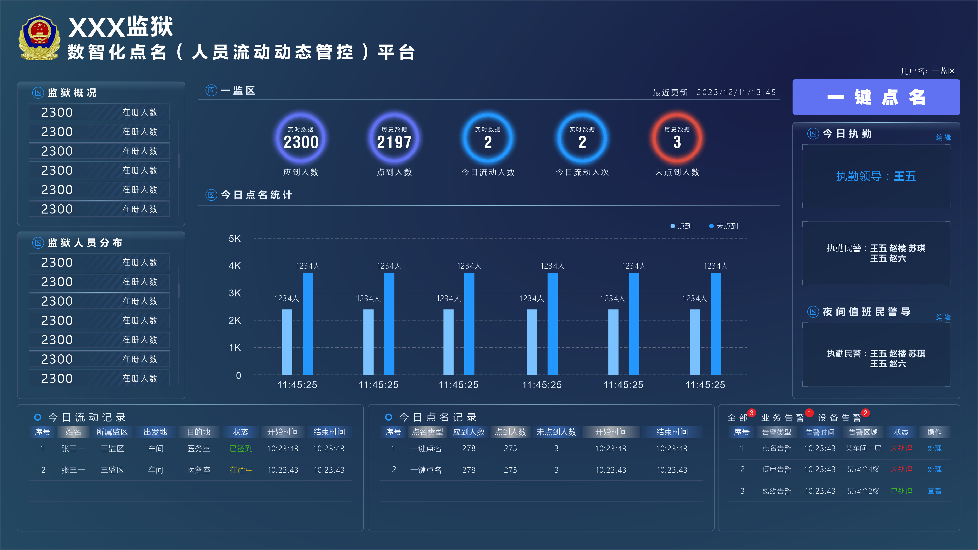 平台自动生成点名统计报表,实时展示人员分布、流动管控、异常告警等关键数据。解决监所对在押人员点名工作和在押人员去向、流动动态进行数字化管控。