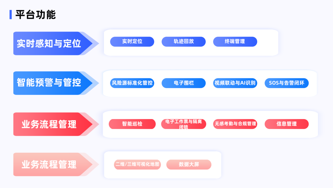 3. 从“事后追溯”到“事前预防、事中可控”:通过电子围栏、风险预警、AI智能识别等功能,提前防范风险;在作业过程中进行实时监督与干预。