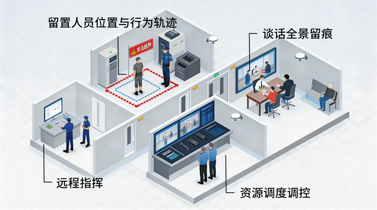 通过为被留置人员佩戴防拆电子脚扣或腕带,系统实时监测其移动轨迹与活动范围。一旦接近或越过预设电子围栏,平台即刻弹窗报警,并联动周边摄像头与声音报警。